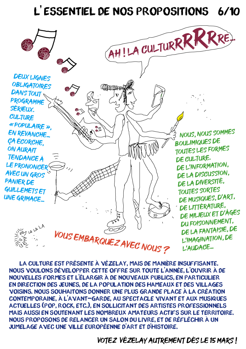 Ah ! La culturrrrrrrrre… Deux lignes obligatoires dans tout programme sérieux. « Populaire », en revanche... ça écorche, on aurait tendance à le prononcer avec un gros panier de guillemets et une grimace… Nous, nous sommes boulimiques de toutes les formes de culture. Du foisonnement, de la fantaisie, de l’imagination, de l’audace… Vous embarquez avec nous ?